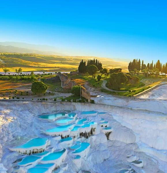 Siz değerli konuklarımızı yukarıdaki biniş noktalarından alarak Denizli'ye hareket ediyoruz. Sabah alacağımız ekstra sabah kahvaltısı sonrasında Kalsiyum karbonat’ın kimyasal reaksiyon sonucu çökelmeyle oluşmuş doğa harikası Travertenler’i geziyoruz. Travertenlerin yakınında M.Ö 190 yılında Bergama kralı 2. Eumenes tarafından kurulan, M.Ö ikinci yüzyılda Roma egemenliğine giren, Anadolu’nun en zengin Nekropol’üne sahip Hierapolis (Kutsal Şehir) Antik Kenti’ni geziyoruz. Sırasıyla; Frontinus Caddesi, Agora, Güney Bizans Kapısı, Gynnasyum, Tritonlu Çeşme, İon Sütun Başlıklı Ev, Büyük Hamam Kompleksi, Tiyatro, Plutonium, Apollon Kutsal Alanı’nı gezdikten sonra sizlere fotoğraflarınızı çekebilmeniz için serbest zaman veriyoruz. Ardından otelimize hareket ediyoruz. Öğle saatlerinde otelimize giriş yapıyoruz. Otelimize giriş sonrasında dileyen misafirlerimiz dinlenebilir, dileyen misafirlerimiz otelin termal havuz imkanlarından faydalanabilirler. Akşam yemeği ve konaklama Pamukkale'deki otelimizde.